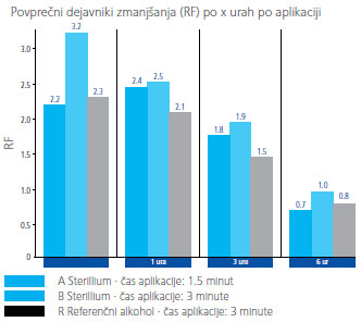 Sterillium je bil z aplikacijskima časoma 1.5 in 3 minute vsakič vsaj tako učinkovit kot referenčni postopek. Prav tako se je stopnja kolonizacije bakterij približno ujemala z referenčnim alkoholom.