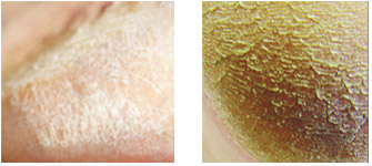 Na zgornji sliki vidimo, da običajno kremo nanašamo, ko so prsti nog razprti. Ko se nato prsti v čevlju stisnejo, ostane med njimi neopažen preostanek kreme, ki se ni vpila (slika desno).