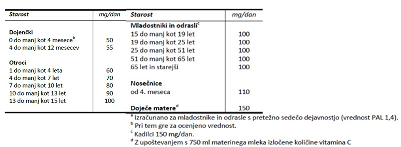 V nadaljevanju so v tabeli prikazani priporočeni dnevni vnosi vitamina C.