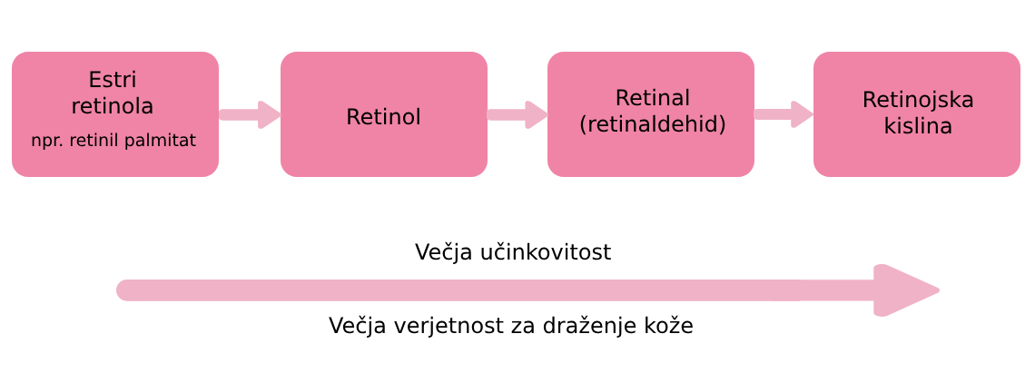 - Retinol je učinkovitejši od estrov retinola, saj zahteva manj korakov za pretvorbo (retinol → retinal → retinojska kislina), a še vedno ni neposredno aktiven.