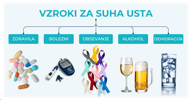 - Obisk zobozdravnika ali zdravnika: Če se težave s suhimi usti pogoste ali hude, je priporočljivo obiskati zobozdravnika ali zdravnika, da ugotovi osnovni vzrok in priporoči ustrezno zdravljenje.