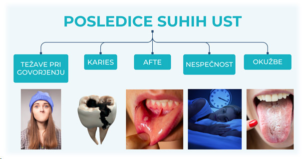 - Nelagodje: Suha usta lahko povzročijo občutek nelagodja in motijo vsakodnevne aktivnosti, kot so govorjenje, žvečenje hrane in požiranje.