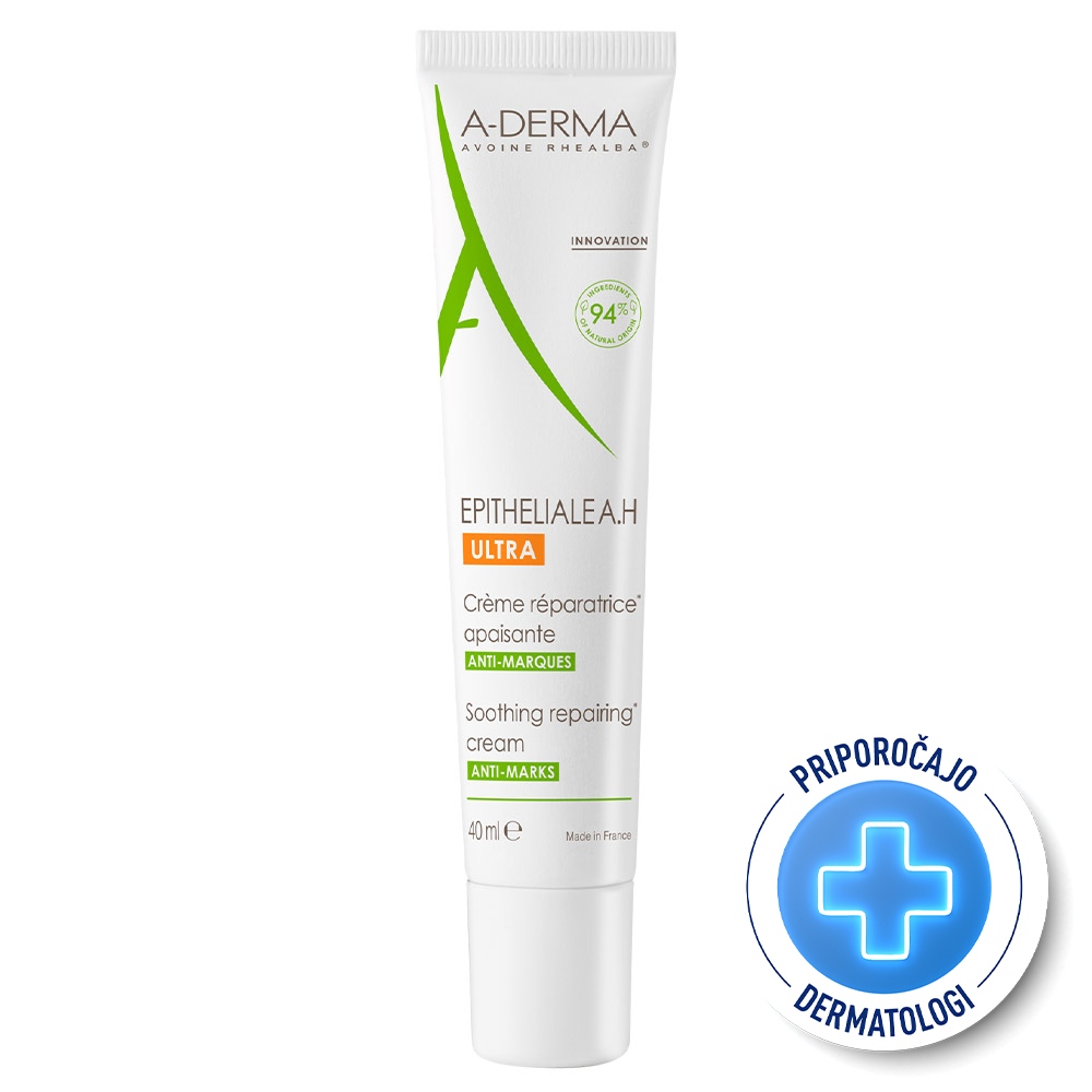 A-Derma Epitheliale A.H. Ultra pomirjajoča, obnavljajoča krema. Proti sledem brazgotin. Oslabljena koža. Za oslabljeno kožo po dermatoloških posegih ali pri površinskih epidermalnih spremembah, ki lahko pustijo sledi brazgotine.