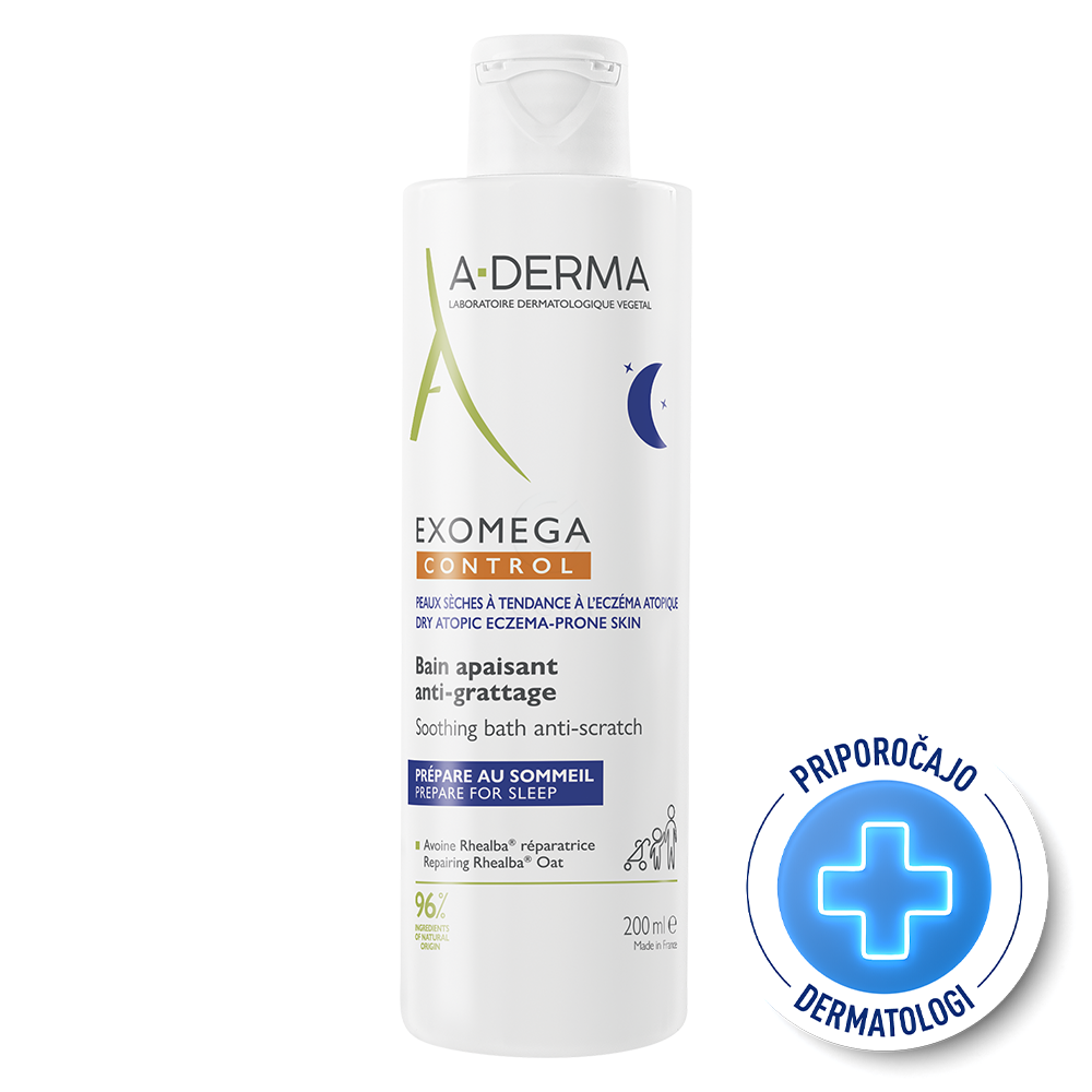 A-Derma Exomega Control pomirjujoča kopel proti praskanju je izdelek primeren za dojenčke in otroke, od 6.meseca dalje. Za suho kožo, nagnjeno k atopijskemu dermatitisu. Za pripravo na dober spanec.