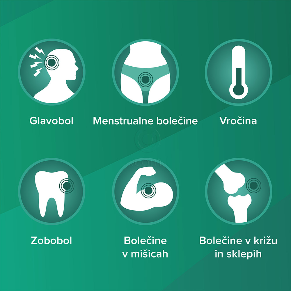 - za lajšanje bolečin pri glavobolu, zobobolu, vnetem grlu, bolečinah v hrbtu, mišicah in sklepih, bolečinah med menstruacijo, blagih bolečinah zaradi vnetja sklepov ter