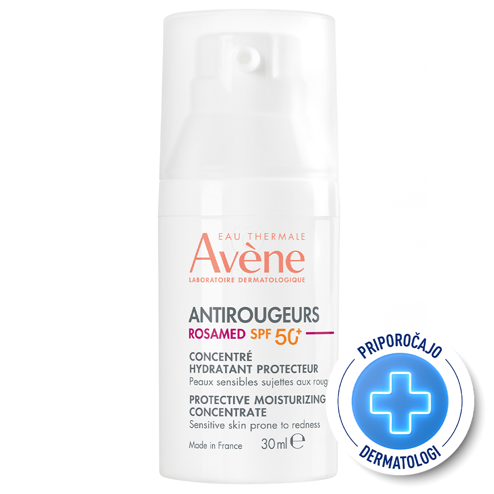 Avène Antirougeurs Rosamed koncentrat proti rdečici ZF50+ je izdelek za dnevno nego, ki zagotavlja tako dolgotrajno delovanje na izvor nastanka rdečice kot tudi zelo visoko zaščito pred UV-žarki, ki so prvi sovražnik kože, nagnjene k rdečici.