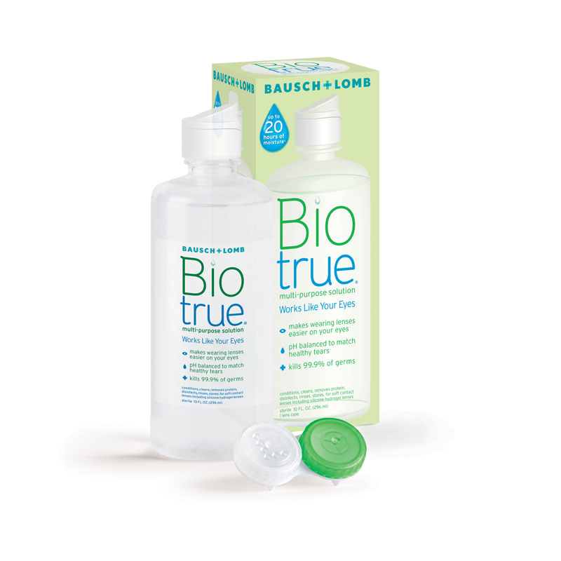 Biotrue tekočina za leče je raztopina za vse vrste mehkih kontaktnih leč, deluje z dvojno dezinfekcijo in preprečuje težave s suhimi očmi. Kontaktne leče navlaži 20 ur dnevno. PH vrednost raztopine je popolnoma enaka PH vrednosti zdravih solz. Raztopina za leče Biotrue deluje kot naravni lubrikant, prav tako preprečuje okužbe z akantamebo, odstranjuje beljakovinske, maščobne obloge ter preprečuje okužbo oči z ostalimi škodljivimi mikroorganizmi.