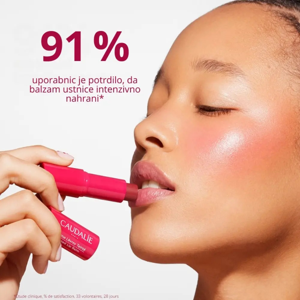 Caudalie obarvan balzam za ustnice neguje in obnavlja suhe ustnice, ne poudarja drobnih linij, zahvaljujoč svoji ultra-mehki teksturi balzama.