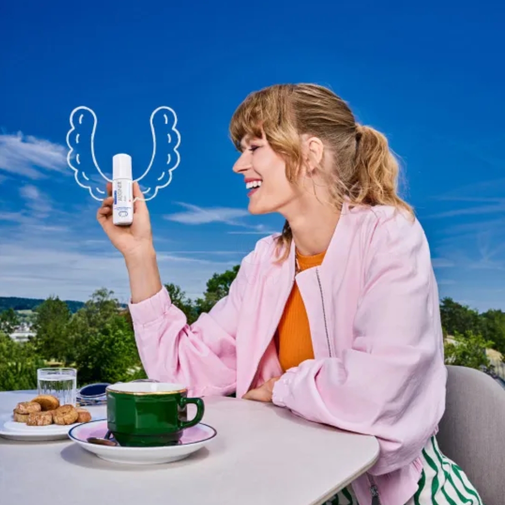 2. metoda: Po ščetkanju zob dobro pretresite stekleničko in v usta brizgnite majhno količino pene. Z jezikom enakomerno porazdelite po zobeh in dlesnih, ostanek pa izpljunite. Na zobe ponovno namestite opornice.