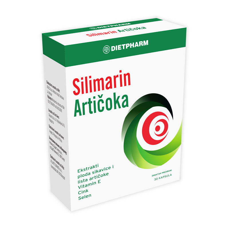 Prehransko dopolnilo Dietpharm Silimarin in artičoka vsebuje izvleček pegastega badlja in artičoke z dodanim Vitaminom E, cinkom in selenom.