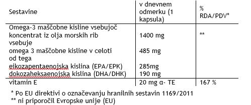 Zaradi visoke vsebnosti vsebnosti omega-3 maščobnih kislin 1 kapsula dnevno zagotavlja 485 mg omega-3 maščobnih kislin. Od tega je 285 mg EPA in 190 mg DHA.