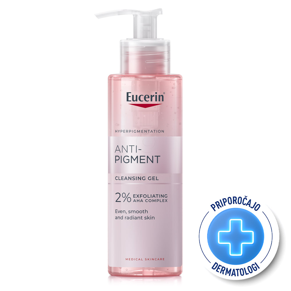 - Čiščenje: Kožo temeljito očistite z Eucerin Anti-Pigment čistilnim gelom. Ta je dovolj nežen za vsakodnevno uporabo in primeren za vse barve kože.