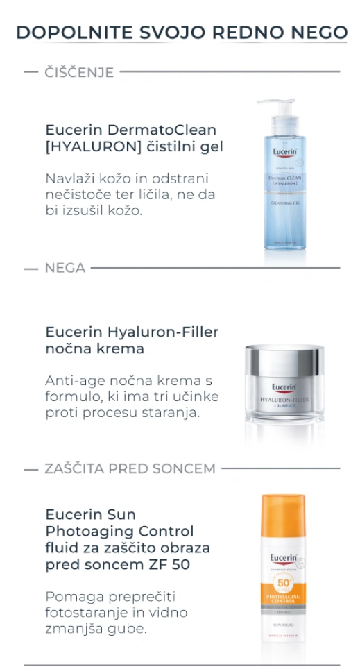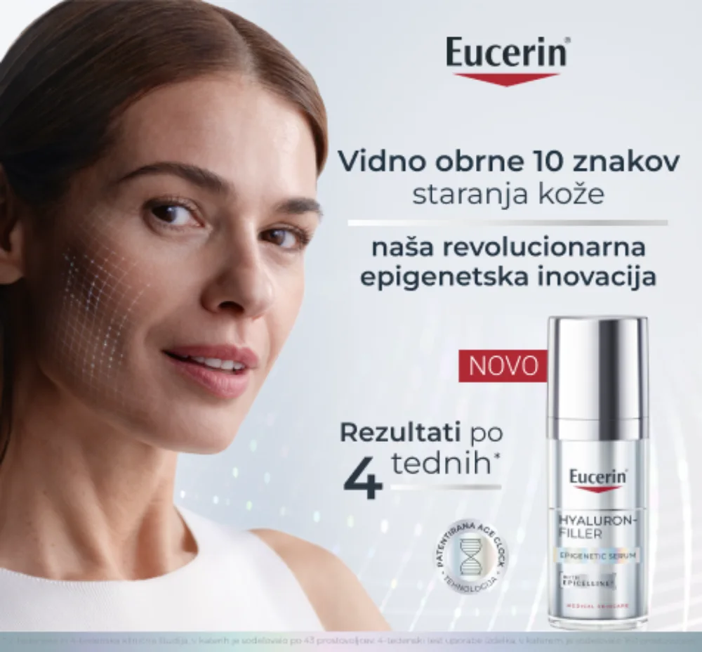 Eucerin Hyaluron-Filler Epigenetic serum - klinično preizkušen, zasnovan na patentirani Age Clock tehnologiji, z glavno sestavino Epicelline, ki dokazano vidno zmanjša znake staranja in tako poskrbi za čvrstejši, mladostnejši videz kože.