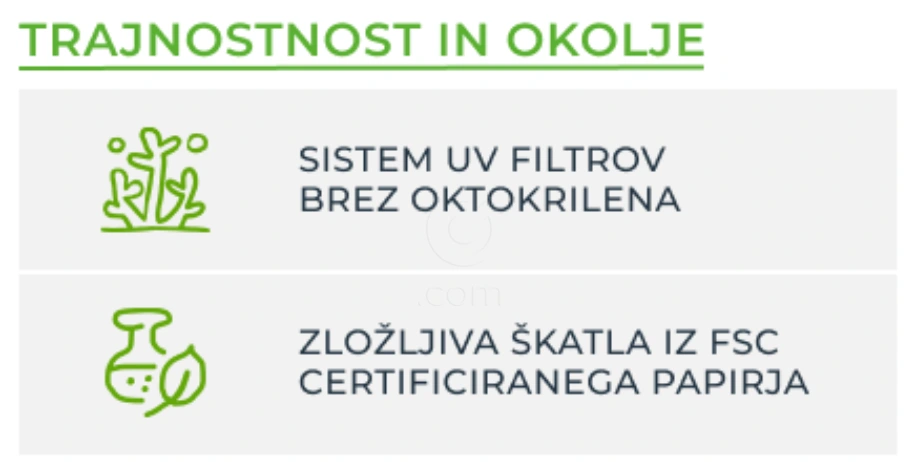 Sistem UV filtrov brez oktokrilena. Zložljiva škatla iz FSC certificiranega papirja.