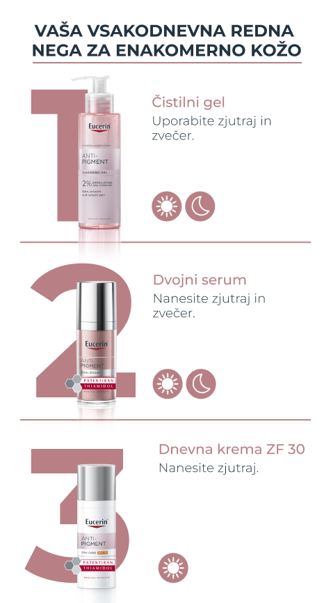 Eucerin Anti-Pigment dvojni serum ne zaščiti kože pred soncem. Ker so sončni žarki ključni dejavnik za hiperpigmentacijo kože, je pomembno, da se zaščitite z ustreznim izdelkom, kar velja tudi v oblačnih dneh. Če Eucerin Anti-Pigment dvojni serum uporabite zjutraj, vam priporočamo, da nato nanesete Eucerin Anti-Pigment dnevno kremo ZF 30, da pomagate zmanjšati vidnost obstoječih sledov aken in zaščitite kožo pred soncem, s čimer dodatno zmanjšate težavo s pigmentacijo zaradi sonca. Pri intenzivni izpostavljenosti soncu izberite višji zaščitni faktor iz linije Eucerin za zaščito pred soncem.