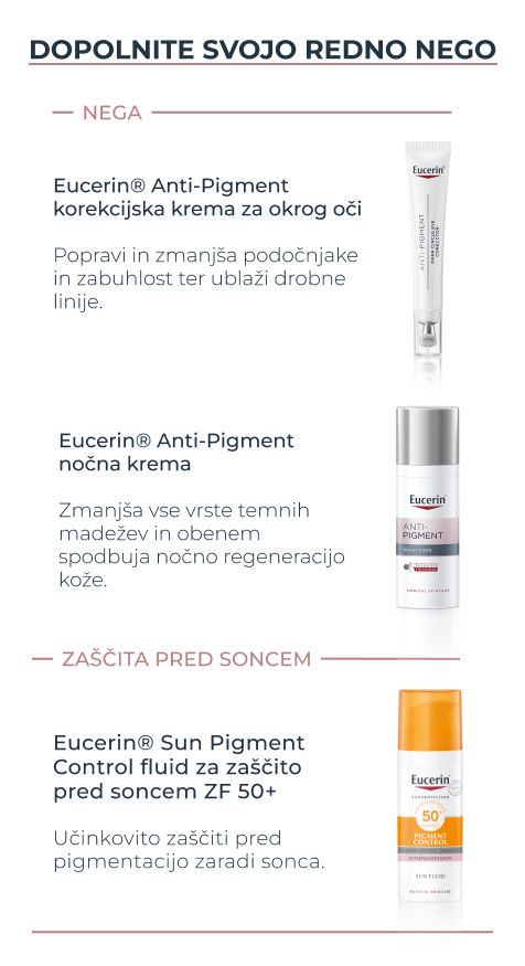 - Za najboljše rezultate izdelek uporabljajte v kombinaciji z Eucerin Anti-Pigment dnevno kremo ZF 30, Eucerin Anti-Pigment nočno kremo in Eucerin Anti-Pigment korektorjem.