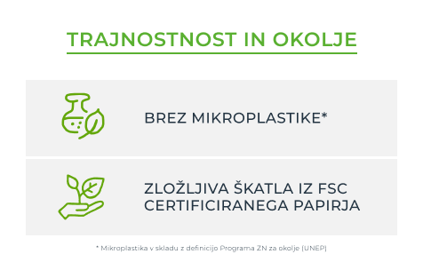 - Ne vsebuje mikroplastike (v skladu z definicijo Programa ZN za okolje)