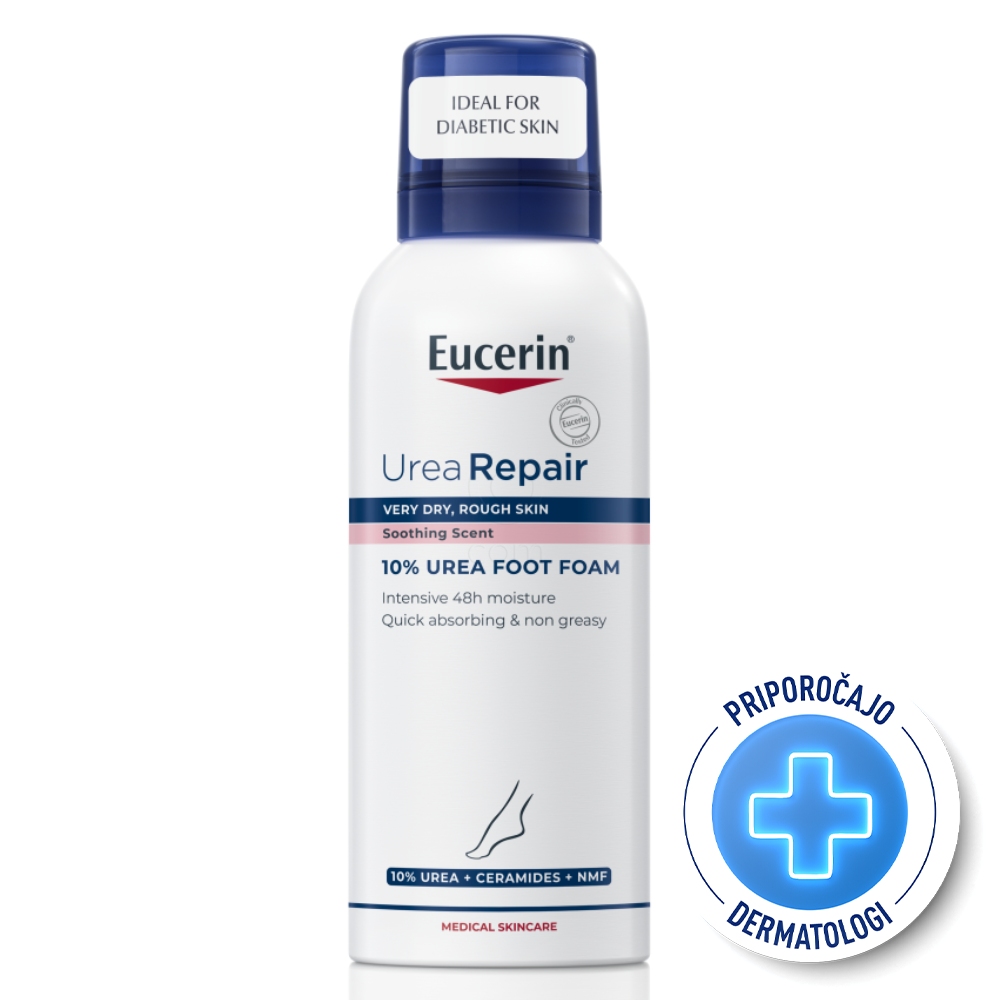 Eucerin UreaRepair Plus 10%, pena za noge neguje hrapavo in suho kožo stopal z intenzivnim vlaženjem, da zagotovi takojšnje olajšanje. Izdelek za nego stopal združuje ključne sestavine za učinkovito odpravljanje suhe kože