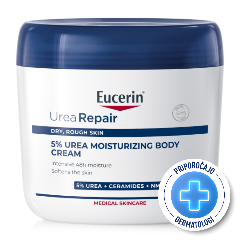 Eucerin UreaRepair plus krema za telo z 5% ureo, cermidi in NVF (naravni vlažilni faktorji).