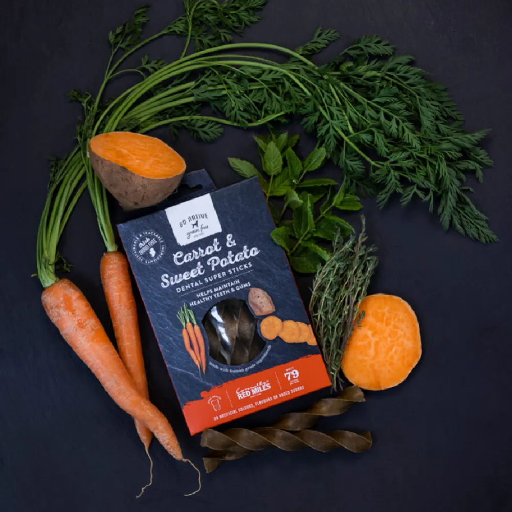 Go Native dentalna spirala - korenje in sladki krompir je okusna zobna palčka za pse brez pšenice in brez občutka krivde, zasnovana kot popoln način za vzpostavitev ključne dnevne zobne rutine vašega psa. Ima edinstven spiralen dizajn, ki pomaga pri odstranjevanju zobnih oblog ter ohranjanju zdravih zob in dlesni. Narejena je iz naravnih sestavin, brez umetnih barvil, arom ali dodanih sladkorjev. Gre za dopolnilno krmno mešanico za pse.