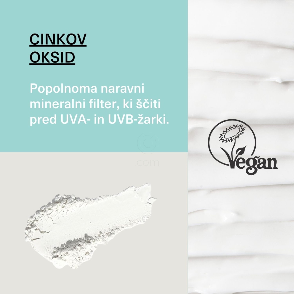 - Cinkov oksid je popolnoma naravni mineralni filter, ki deluje kot fizikalni ščit pred UVA in UVB žarki. Uporabljamo ga v nenano obliki, kar pomeni, da nima vpliva na življenje v vodah.