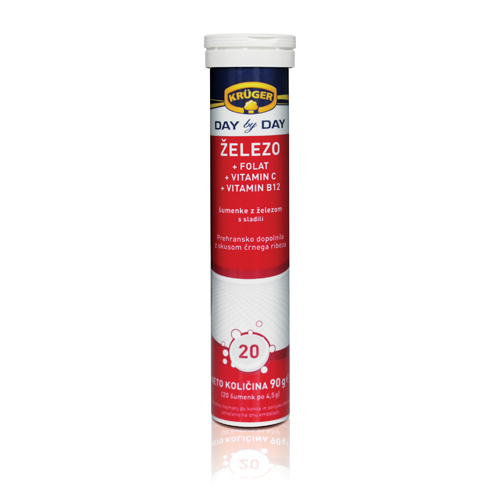 Šumenka Krüger Day by Day z železom in dodanimi vitamini daje osvežujočo pijačo z okusom črnega ribeza, ki zadošča dnevni potrebi organizma po naslednjih vitaminih: železu, folatu, vitaminu C in vitaminu B12.