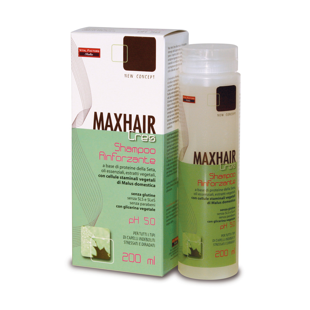 Šampon Maxhair Cres proti izpadanju las nežno čisti, regenerira in ponovno vzpostavi naravno ravnovesje lasišča. Inovativni kompleks z izvlečki zarodnih celic domačega jabolka zagotavlja hranila bistvenega pomena za naravno rast vaših las in lasnega mešička ter tako upočasni izpadanje las. S pomočjo beljakovine svile, ginsenga in izvlečka prosa, vaše lase naredi močne ter tako preprečuje cepljenje lasnih konic. Šampon vsebuje tudi mentol, eterična olja in brezo, ki spodbujajo mikrocirkulacijo lasišča in ga čistijo. Ob redni uporabi lasem vrača naravno vlažnost, jih ščiti pred vremenskimi vplivi in jih naredi mehke ter sijoče. Primeren je za vse vrste las, posebno za krhke, suhe in oslabljene lase, ker vsebuje nežne sestavine, pa tudi za ljudi z občutljivim lasiščem.