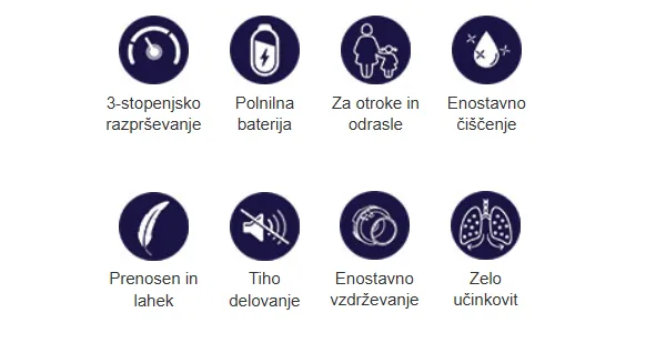 Samodejno čiščenje mesh membrane – Ob zaznavi prisotnosti tekočine v posodici, sproži samodejno čiščenje mesh membrane, s čimer zagotovi enakomerno razprševanje, pravilno doziranje ter varno in higienično uporabo.