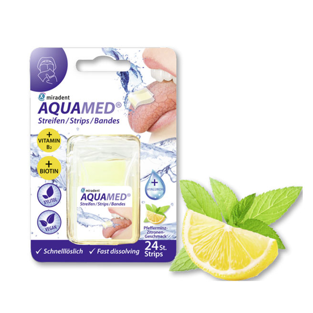 Miradent Aquamed Strips, lističi za suha usta z okusom poprova meta - limona (24 lističev)