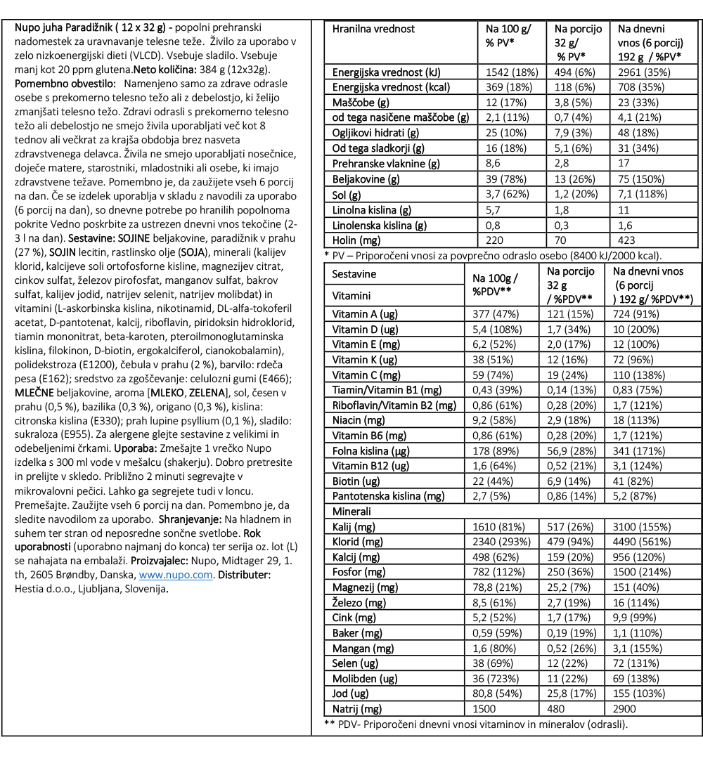 Nupo juha Paradižnik - popolni prehranski nadomestek za uravnavanje telesne teže. Živilo za uporabo v zelo nizkoenergijski dieti (VLCD). Vsebuje sladilo. Vsebuje manj kot 20 ppm glutena.