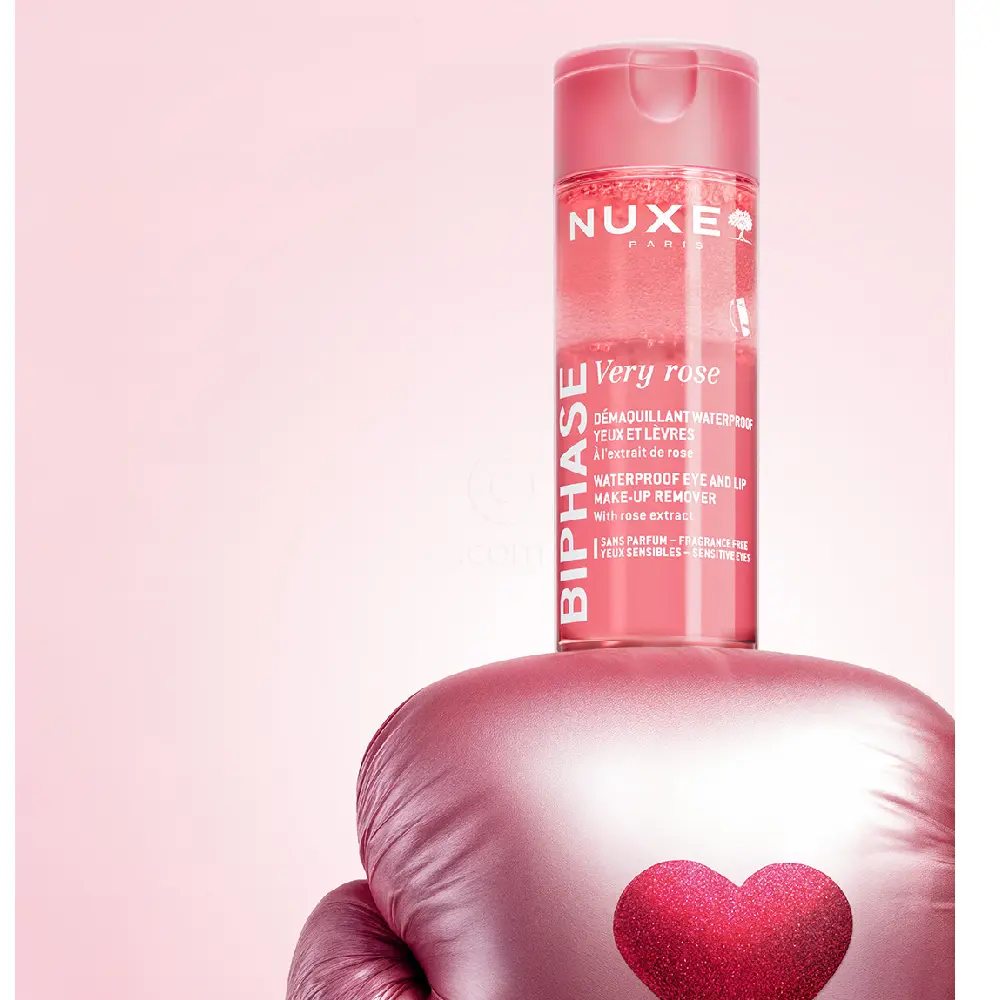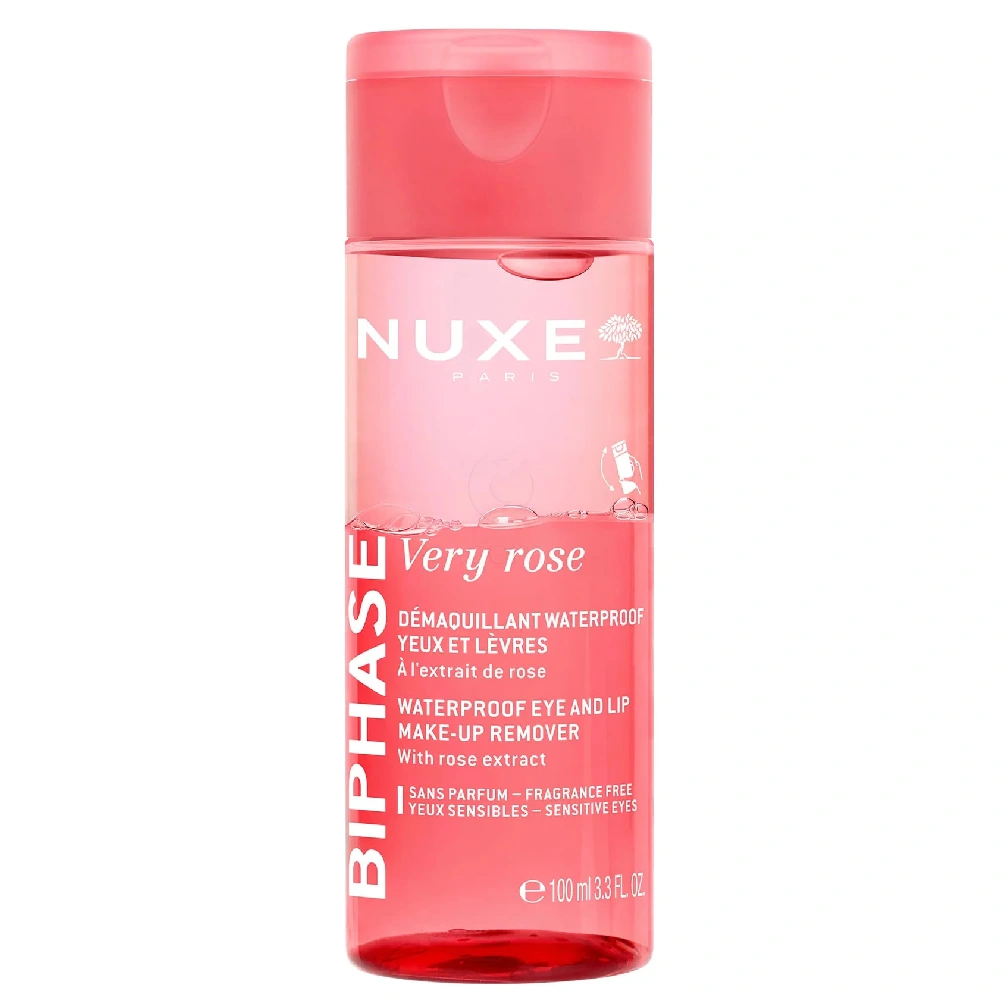 Nuxe Very Rose Biphase dvofazni odstranjevalec ličil za oči in ustnice z enim samim potegom in brez drgnjenja popolnoma raztopi vse vrste ličil, tudi najbolj obstojna, ter odstrani nečistoče (onesnaženje, odvečni sebum in drugo).