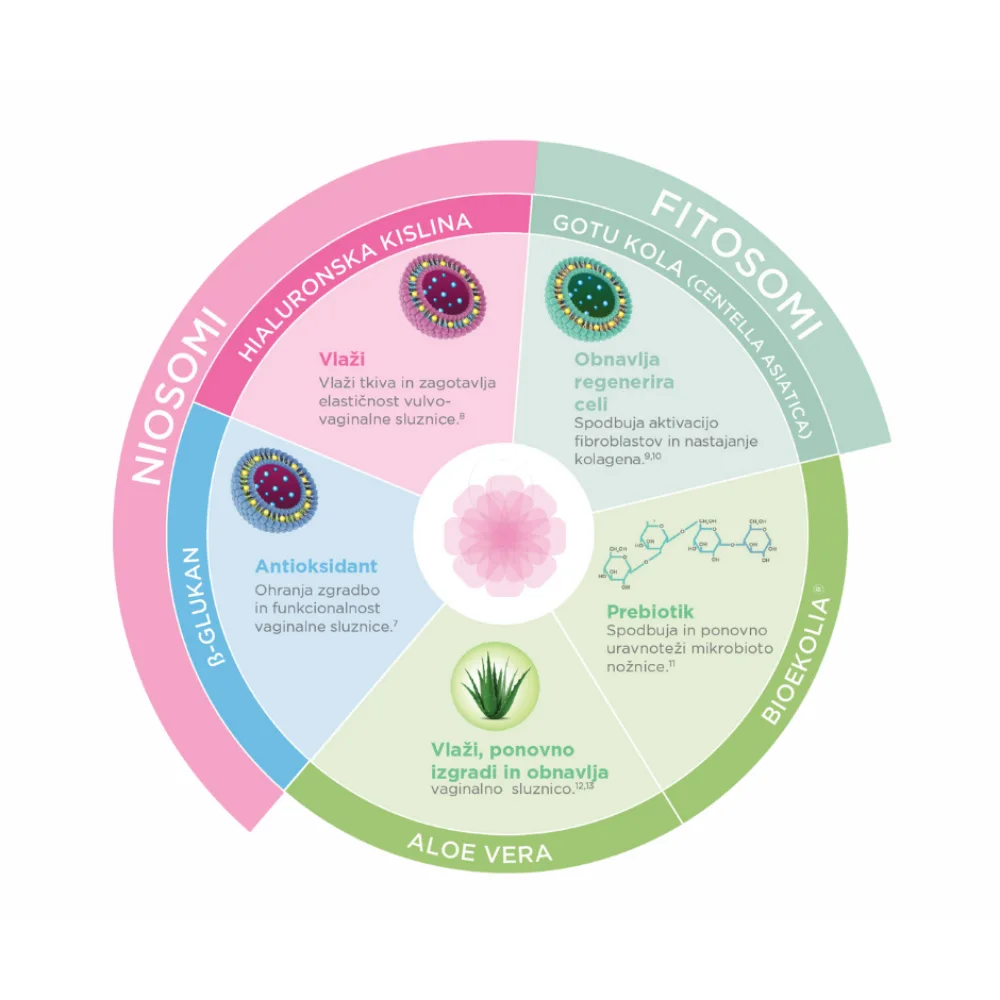 - Fitosomi rastline Gotu kola (Centella asiatica): spodbujajo naravni proces obnavljanja nožnične sluznice.