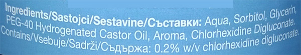 Aqua, Sorbitol, Glycerin, PEG-40 Hydrogenated Castor Oil, Aroma, Chlorhexidine Digluconate.