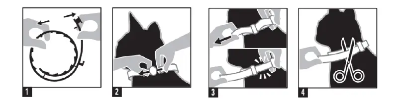 Dermalna uporaba. Živali se namesti eno ovratnico okoli vratu. Mačkam se namesti eno ovratnico dolžine 38 cm. Samo za zunanjo uporabo.
