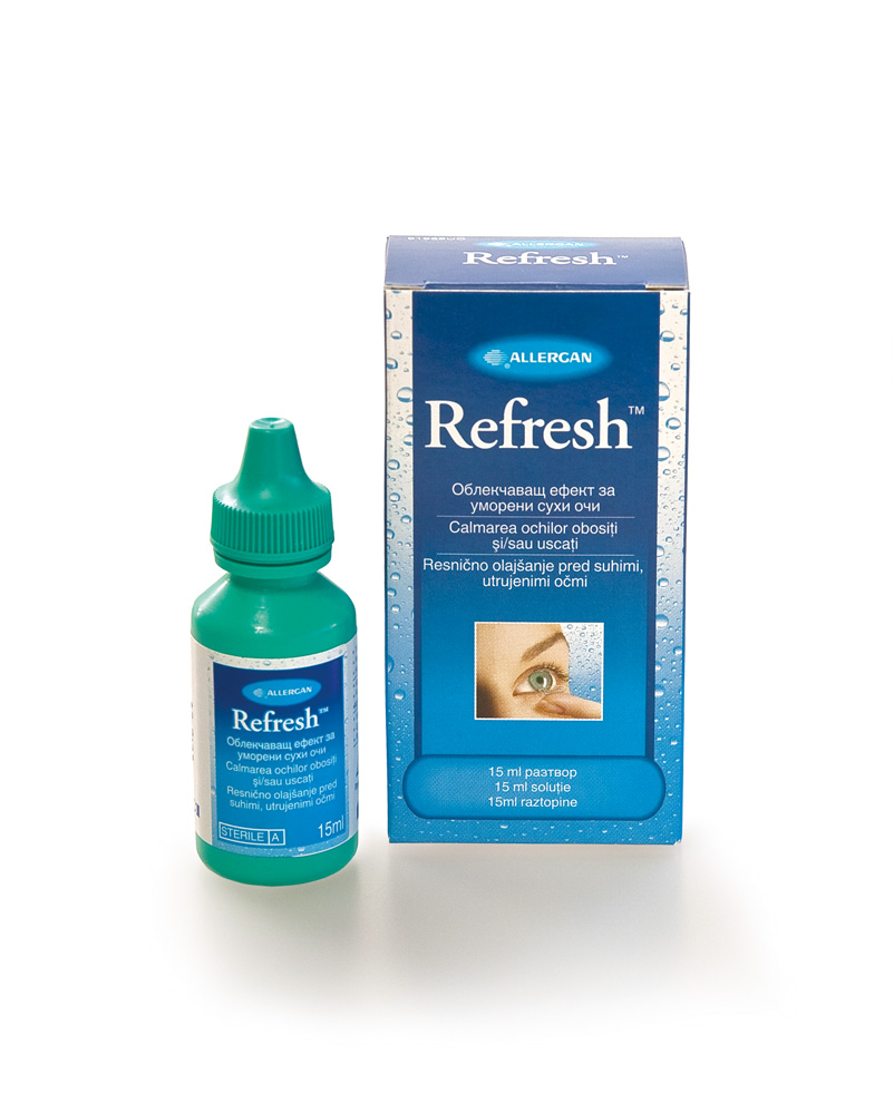 Kapljice za oči, za vse uporabnike kontaktnih leč. Pomirja suhe, utrujene oči. Večodmerne kapljice Refresh omogočajo takojšnjo pomiritev in dolgotrajno udobje za vse uporabnike kontaktnih leč. Edinstvena sestava lajša suhost in razdraženost oči, ki ju povzročajo prah, bleščanje, cvetni prah, onesnažen zrak ali preveč dela in tako omogoča večje udobje pri nošenju leč skozi ves dan.