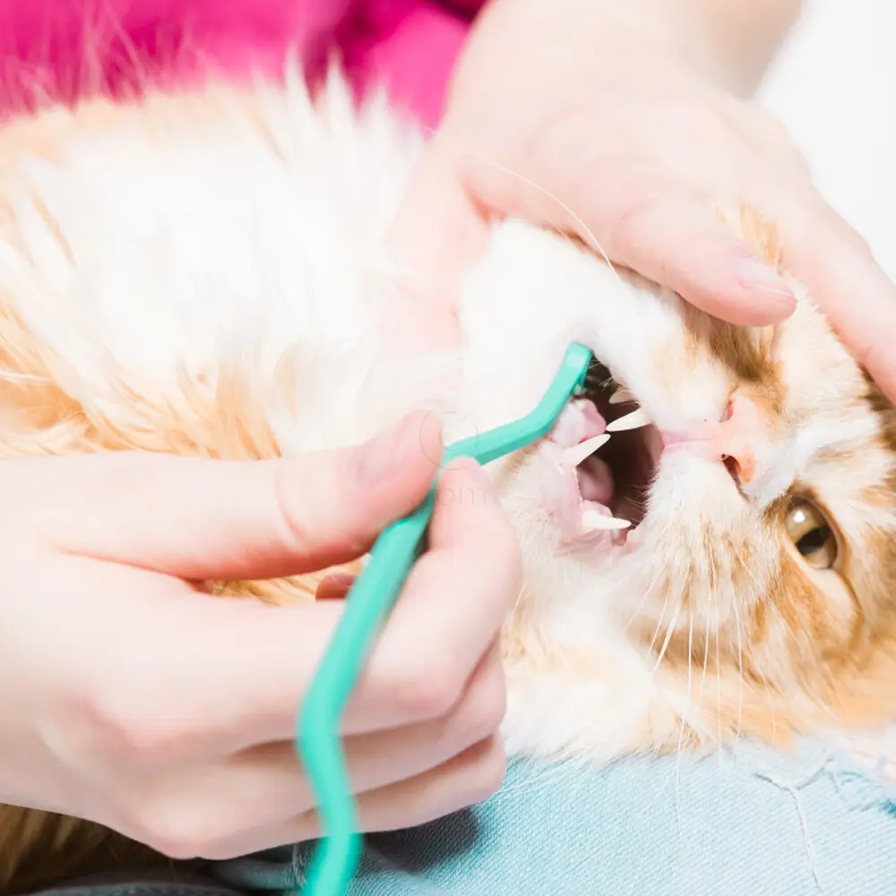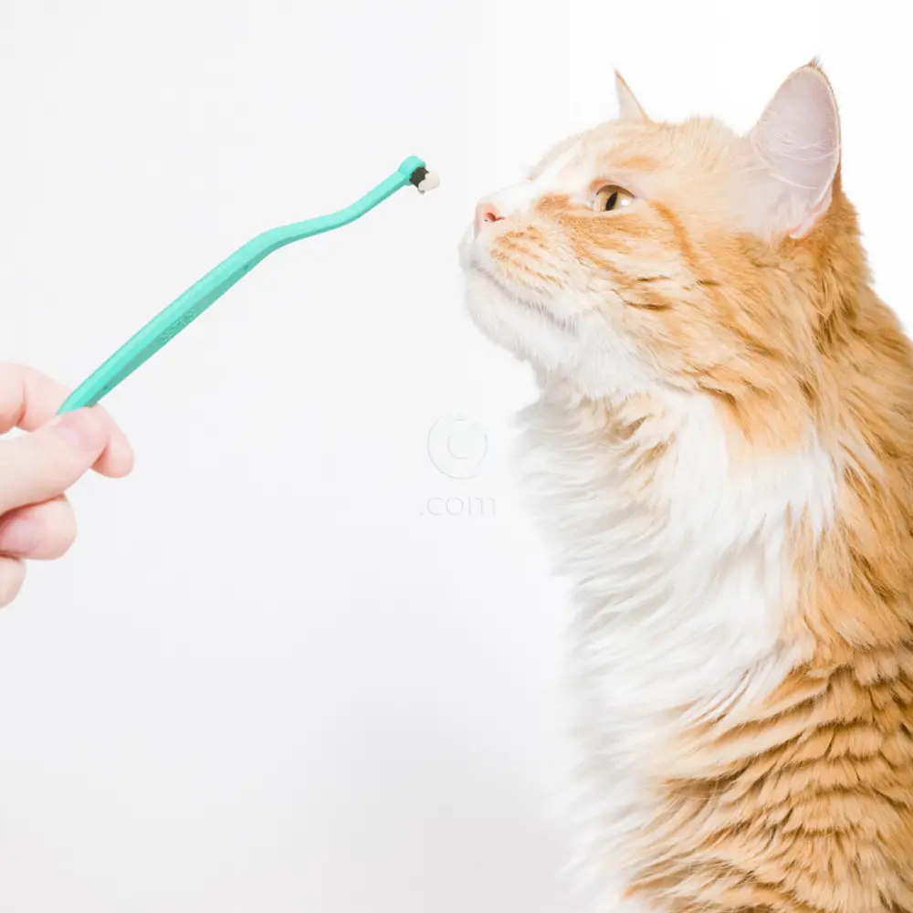 Nežno pričnite ščetkati sprednje zobe vašega mačka in se počasi pomikajte proti zadnjemu delu zobovja. Vsak zob temeljito očistite z mehkimi ščetinami, med zobmi pa s pobiralom odstranite vse obloge. Po uporabi ščetko splaknite z čisto vodo in poskrbite da se dobro osuši na zraku. Sveža voda naj bo mačku vedno na voljo. Opozorilo: shranjujte izven dosega otrok in živali.
