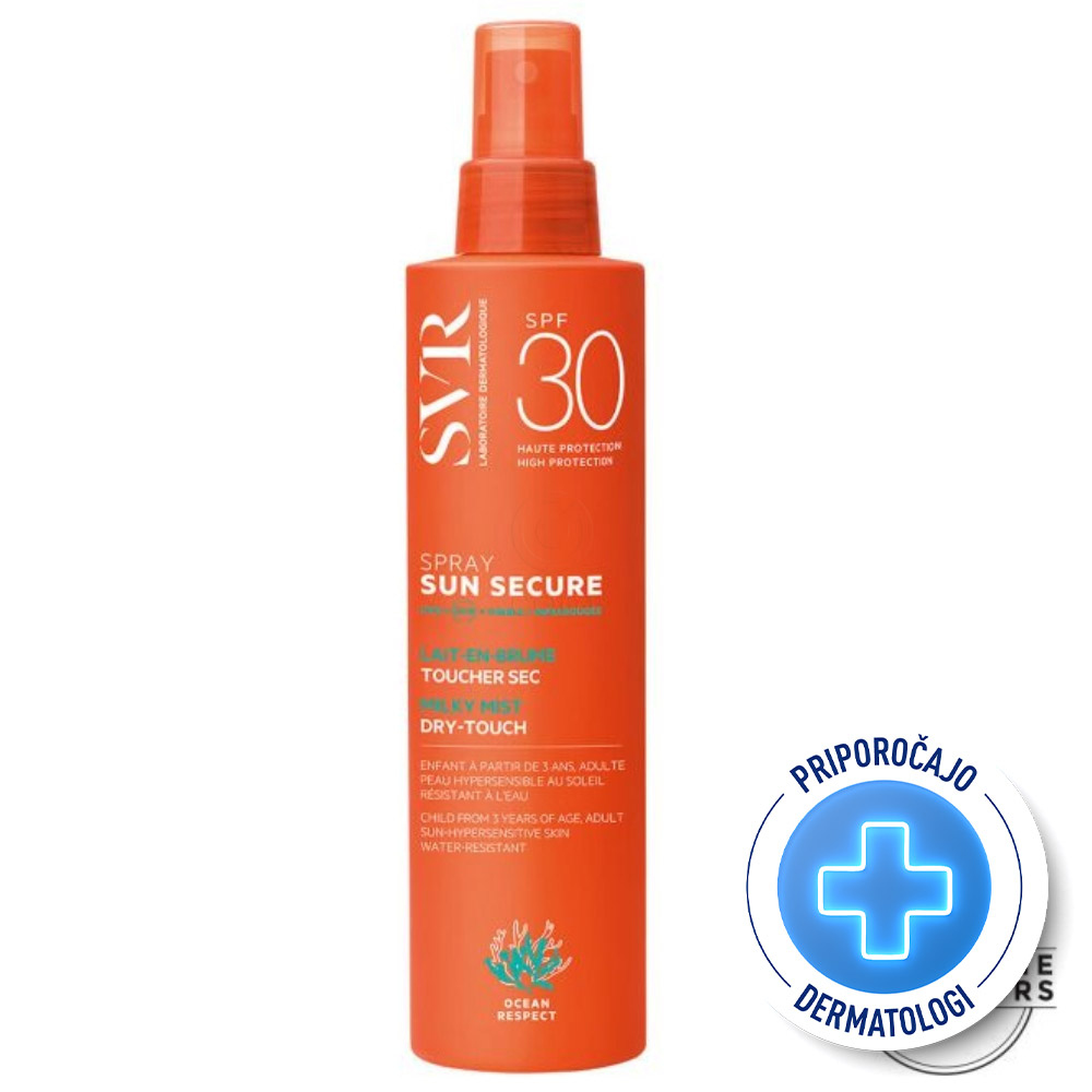 SVR Sun Secure sprej - ZF30+ omogoča ekspresen in homogen nanos. Še vedno brez kompromisov glede senzoričnosti z nevidnim zaključkom in brez belih sledi. Njegova mlečna in izjemno fina tekstura se zelo enostavno razmaže in pusti nemasten in nelepljiv zaključek. Koža je navlažena in satenasta. Zaradi nežnega poletnega vonja si ga želite nanesti znova in znova. Visoko odporen na vodo. Odporen na znoj in obrabo.