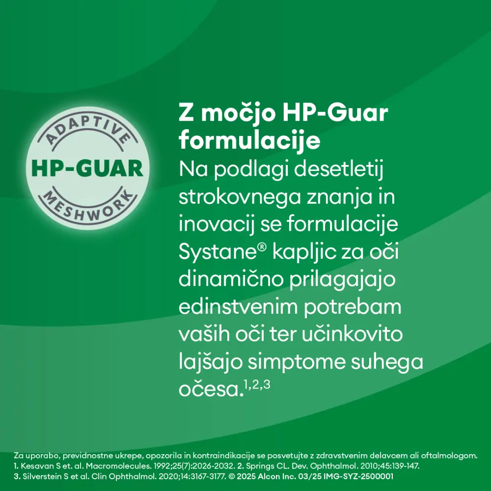 Vlažilne kapljice za oko Systane Ultra so namenjene takojšnjemu lajšanju pekočega občutka in draženja zaradi suhih oči. Zdaj na voljo brez konzervansov. Tehnološko dovršena sestava vlažilnih kapljic nudi takojšnje olajšanje simptomov, napredna formulacija brez konzervansov pa je primerna tudi za občutljive oči in pogosto uporabo. Systane Ultra vlažilne kapljice brez konzervansov vsebujejo hidroksi propil-gvar (HP-gvar), ki skupaj s sorbitolom tvori elastično zaščitno mrežo na površini očesa. HP-gvar je dvakrat (2x) bolj mazljiv kot hialuronska kislina sama. Aktivni učinkovini polietilenglikol (PEG) in propilen glikol (PG) vlažita očesno površino, mrežna struktura pa pomembno podaljša njun čas zadrževanja na očesni površini in zagotavlja dolgotrajnejše olajšanje simptomov suhega očesa.