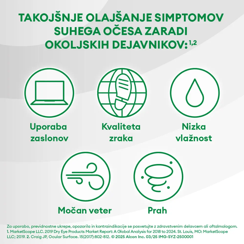 Samo za očesno uporabo. Ne uporabljajte, če je zaporka, ki varuje pred nedovoljenim odpiranjem, poškodovana ali manjka. Ne uporabljajte, če je ovojnina ali plastenka (sterilna embalaža) poškodovana. Da preprečite onesnaženje izdelka, se s konico kapalke nikoli ne dotaknite nobene površine. Če izdelek pogoltnete, poiščite zdravniško pomoč. Če raztopina spremeni barvo ali postane motna, je ne uporabljajte. Po uporabi ponovno namestite zaporko. Kadar izdelka ne uporabljate, mora biti vsebnik tesno zaprt. Raztopino porabite pred iztekom roka uporabnosti, ki je označen na izdelku. Izdelek vsebuje borovo kislino v količini, ki je varna, če izdelek uporabljate po navodilih. Ko plastenko odprete, morate vso raztopino, ki je ne porabite, zavreči po treh mesecih. Shranjujte pri temperaturi do 2 do 30 °C. Shranjujte nedosegljivo otrokom.