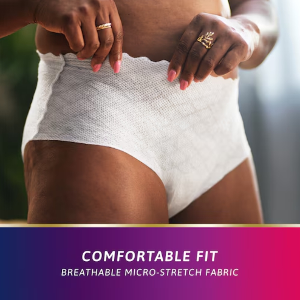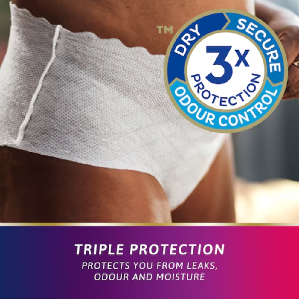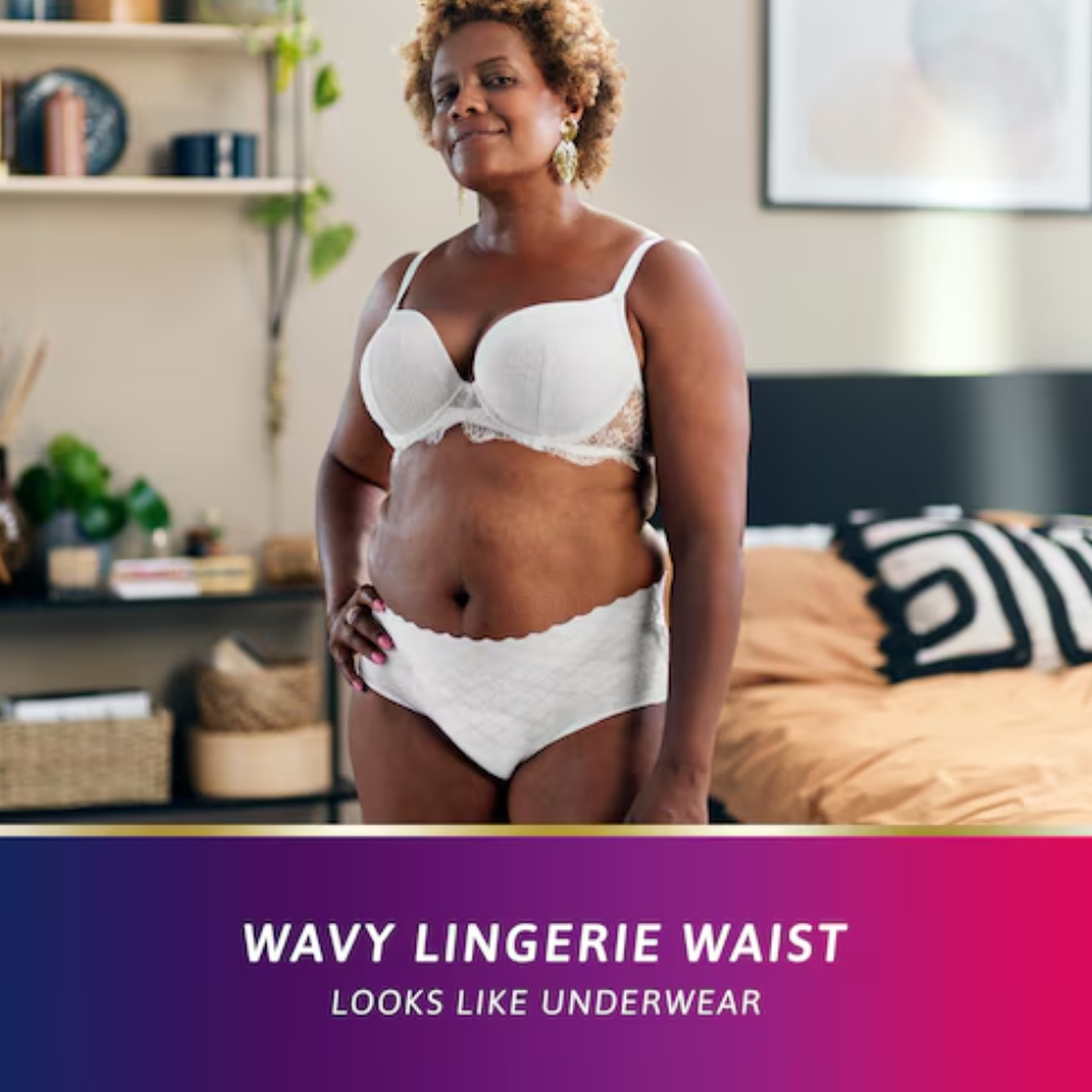Hlačke izgledajo zaradi modnega potiska in nižjega pasu kot žensko spodnje perilo. Tena Silhouette inkontinenčne hlačke nudijo trojno zaščito: