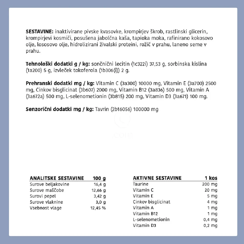 inaktivirane pivske kvasovke, krompirjev škrob, rastlinski glicerin, krompirjevi kosmiči, posušena jabolčna kaša, tapioka moka, rafinirano kokosovo olje, lososovo olje, hidrolizirani živalski proteini, rožič v prahu, laneno seme v prahu.
