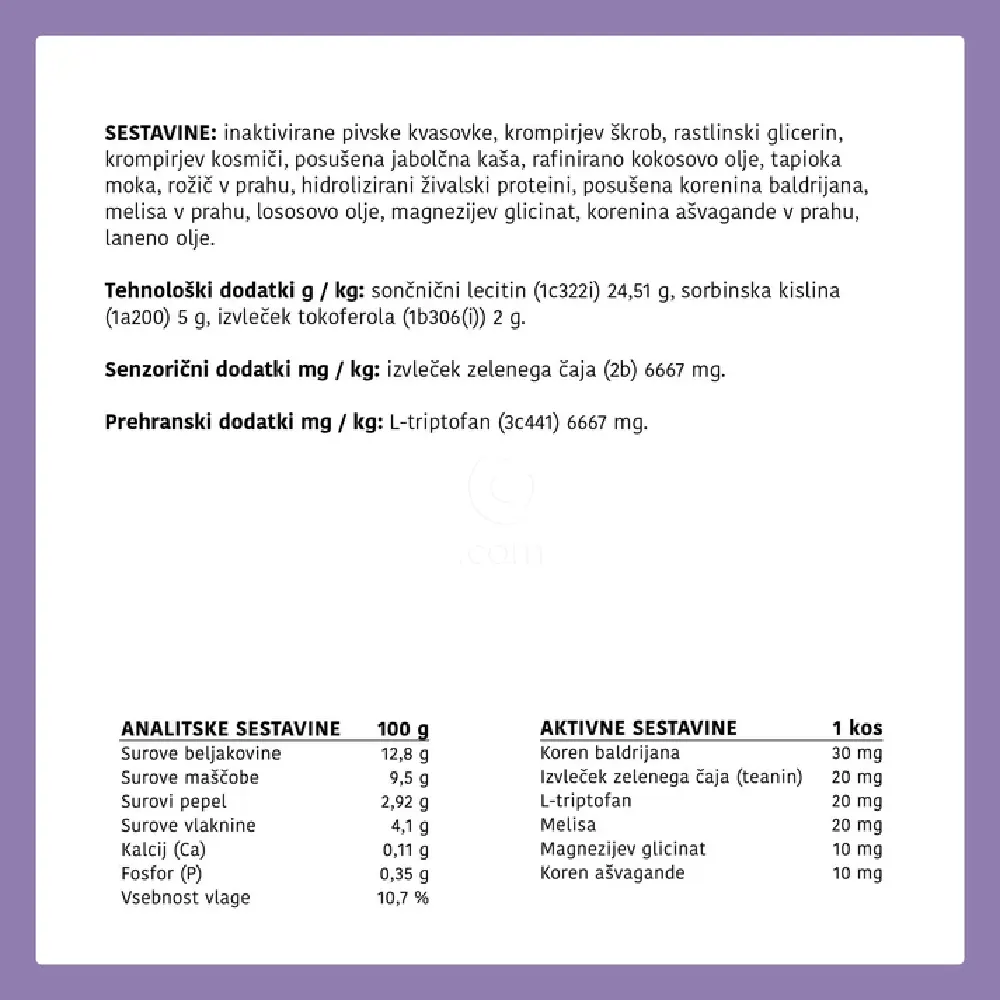 inaktivirane pivske kvasovke, krompirjev škrob, rastlinski glicerin, krompirjev kosmiči, posušena jabolčna kaša, rafinirano kokosovo olje, tapioka moka, rožič v prahu, hidrolizirani živalski proteini, posušena korenina baldrijana, melisa v prahu, lososovo olje, magnezijev glicinat, korenina ašvagande v prahu, laneno olje.