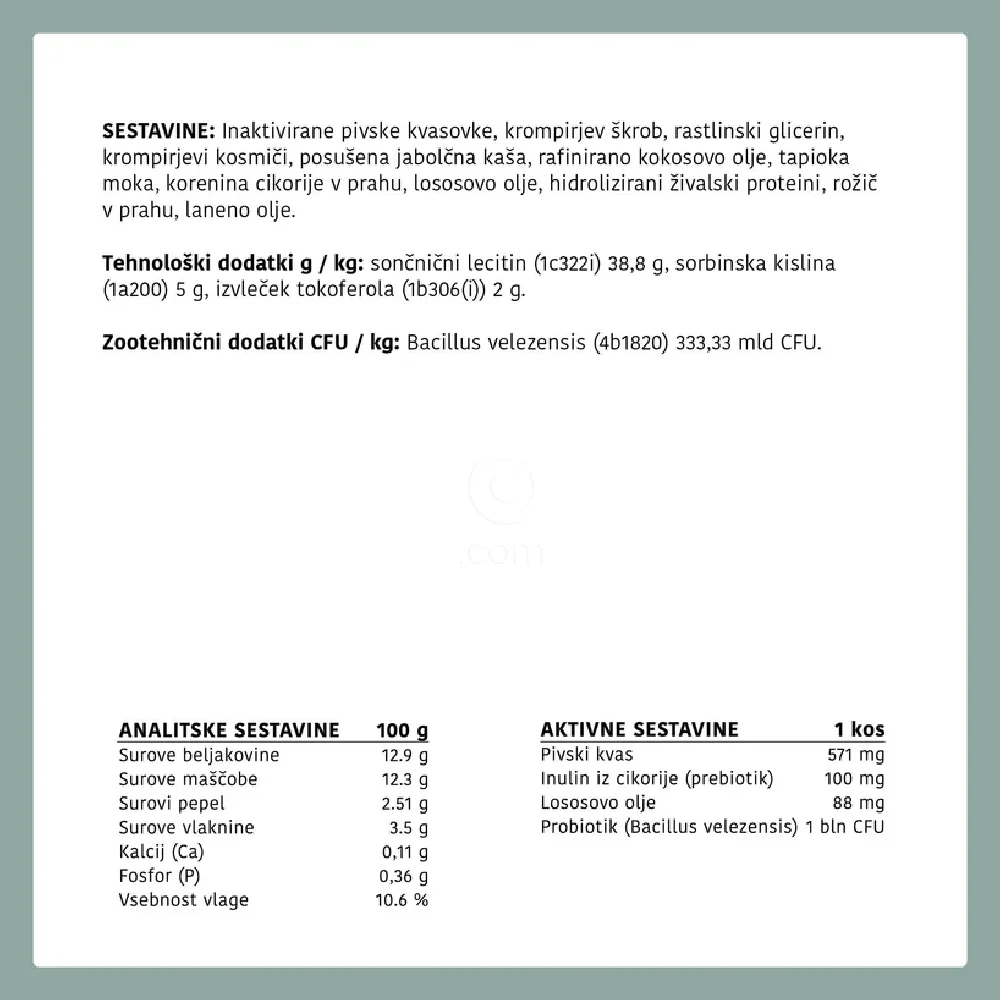 Inaktivirane pivske kvasovke, krompirjev škrob, rastlinski glicerin, krompirjevi kosmiči, posušena