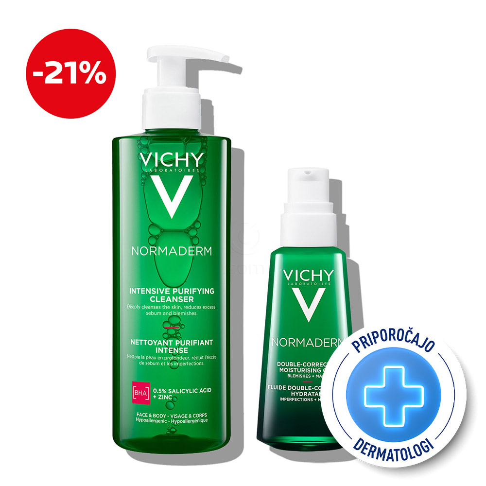 Vichi Normaderm, protokol za mastno in k aknam nagnjeno kožo v odrasli dobi - Dnevna nega in Čistilni gel (50 ml + 400 ml)