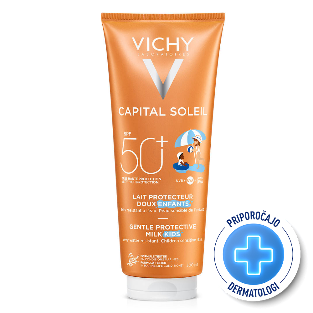 Vichy Capital Soleil zaščitno mleko za otroke ZF 50+ z visoko zaščito za otroke, v velikem pakiranju. Primerno za otroke s svetlo poltjo.
