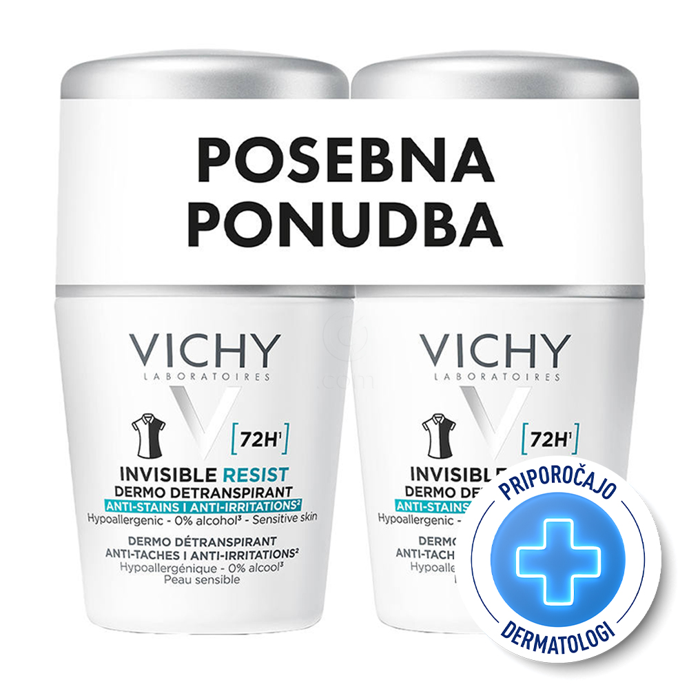 Vichy Invisible Resist 72h, detranspirant proti madežem in razdraženosti - roll-on - paket (2 x 50 ml)