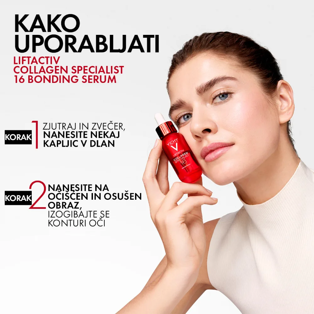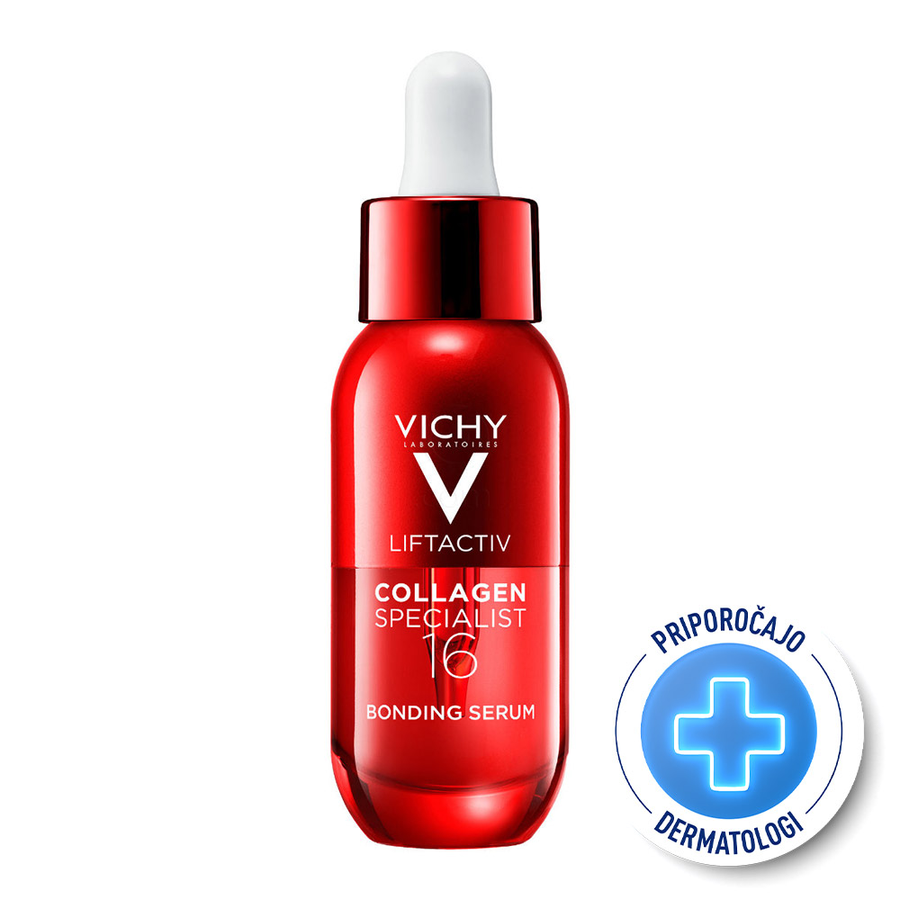 Vichy Liftactiv Collagen Specialist 16 bonding serum za manj gub, manj drobnih linij, izboljšana čvrstost, polnost, manj povešeno kožo, zglajeno polt, izboljšano teksturo kože, tonus, gostoto kože, okrepljeno kožno pregrado, izboljšana obnova kože, sijaj, mehkoba, prožnost, vlaženje in enakomernost polti.