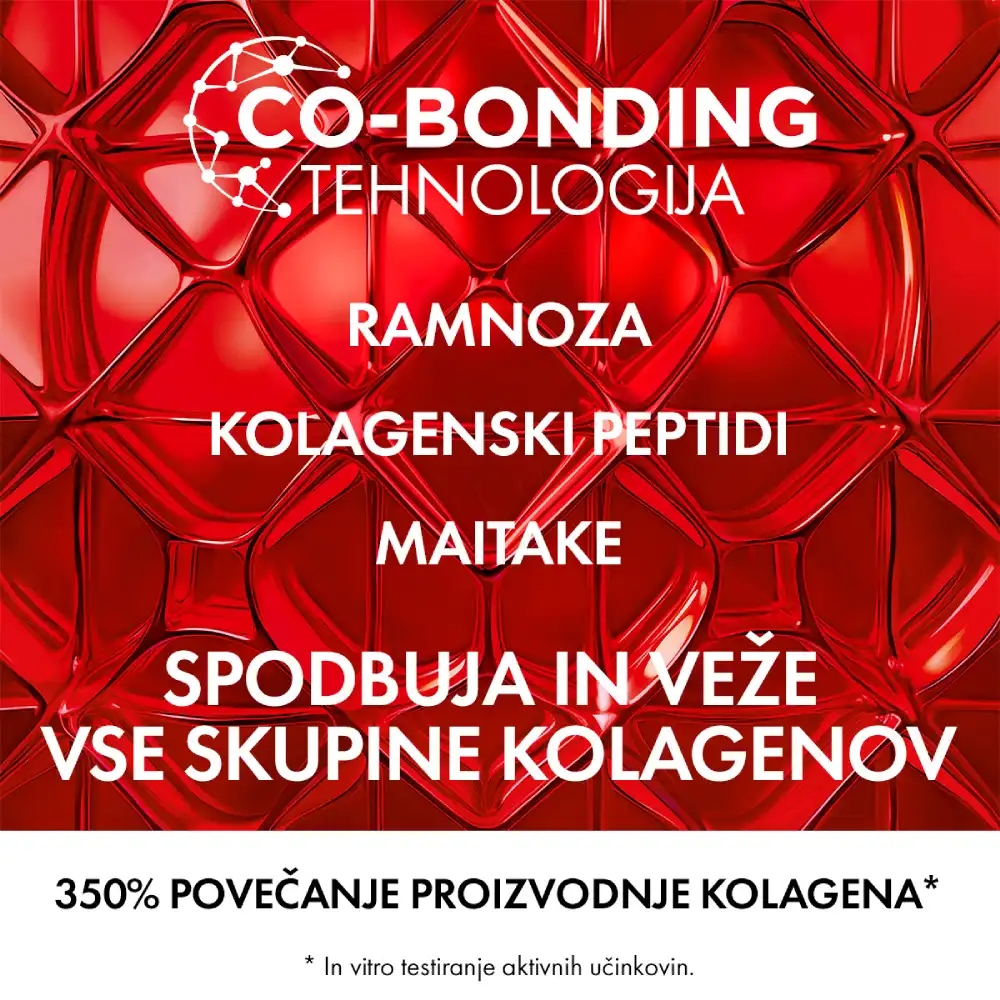 - Tehnologija Co-Bonding [ramnoza + peptidi + maitake]: krepi in veže vse skupine kolagena.