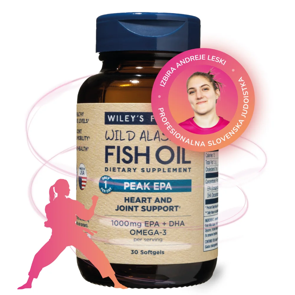 Wiley's Finest Peak EPA Wild Alaskan Fish Oil kapsule z visokimi koncentracijami EPK in DHK. 1250 mg koncentrata ribjega olja visoke kakovosti na kapsulo vsebuje idealno 3:1 razmerje med EPA in DHK.